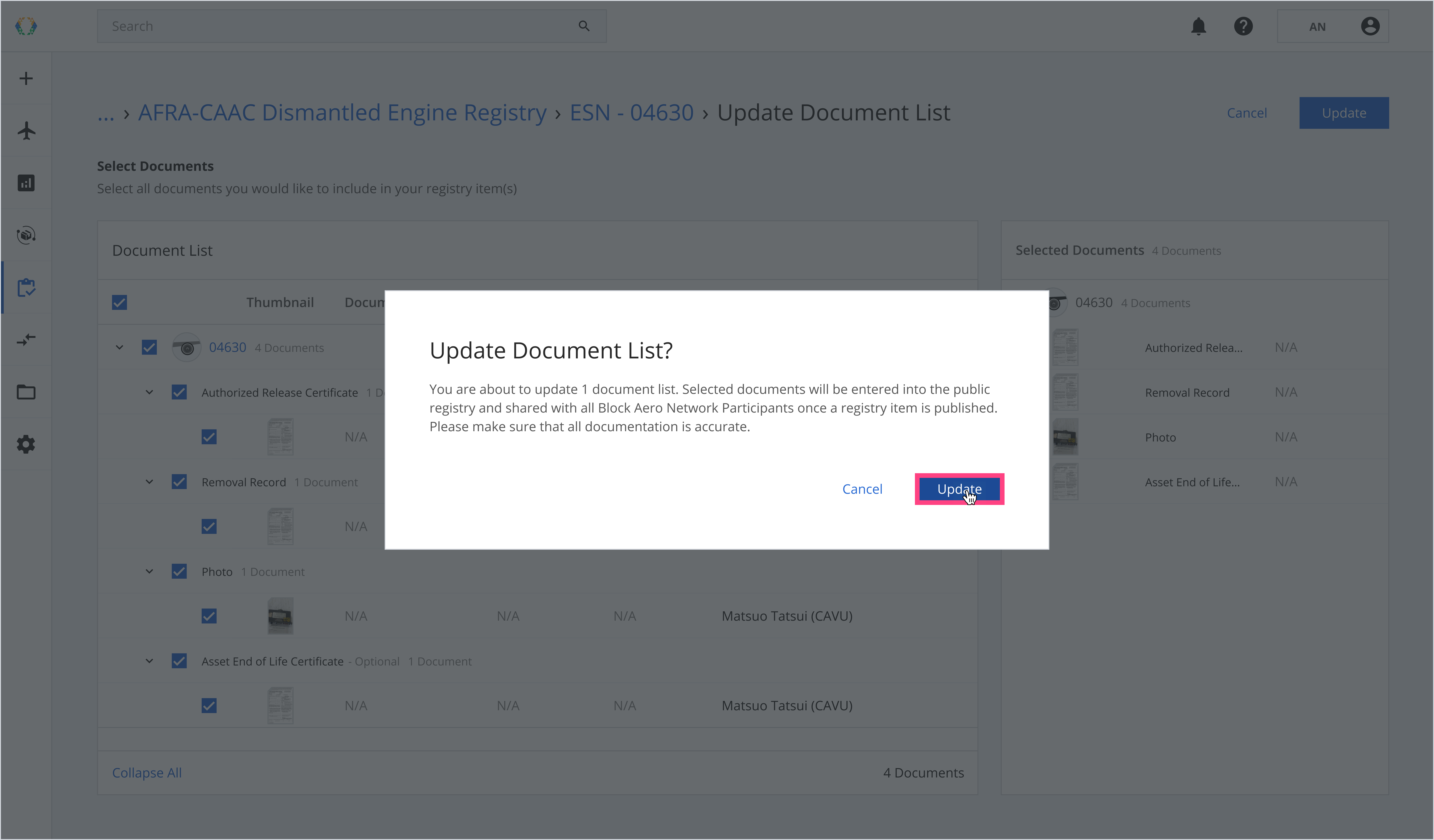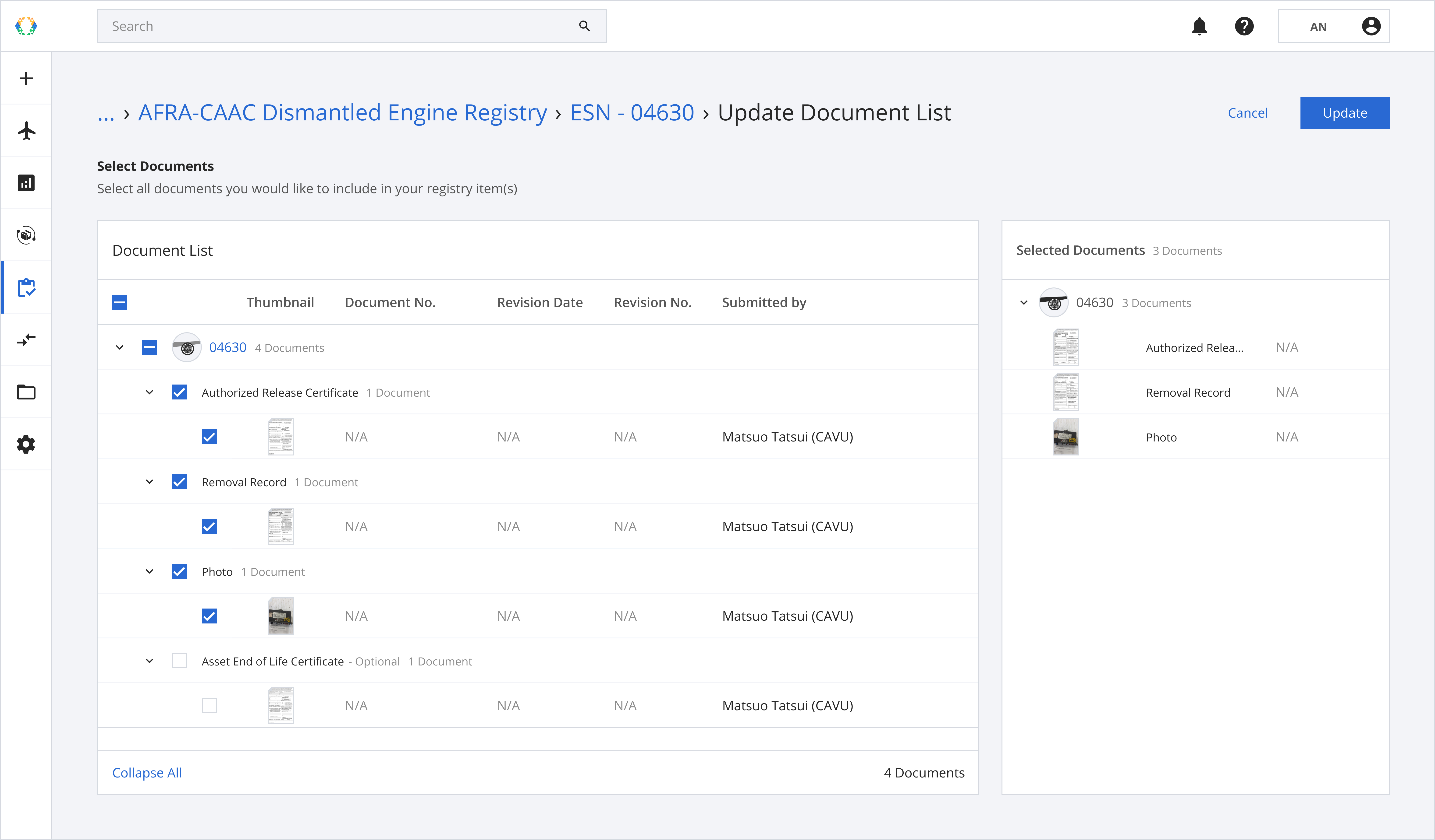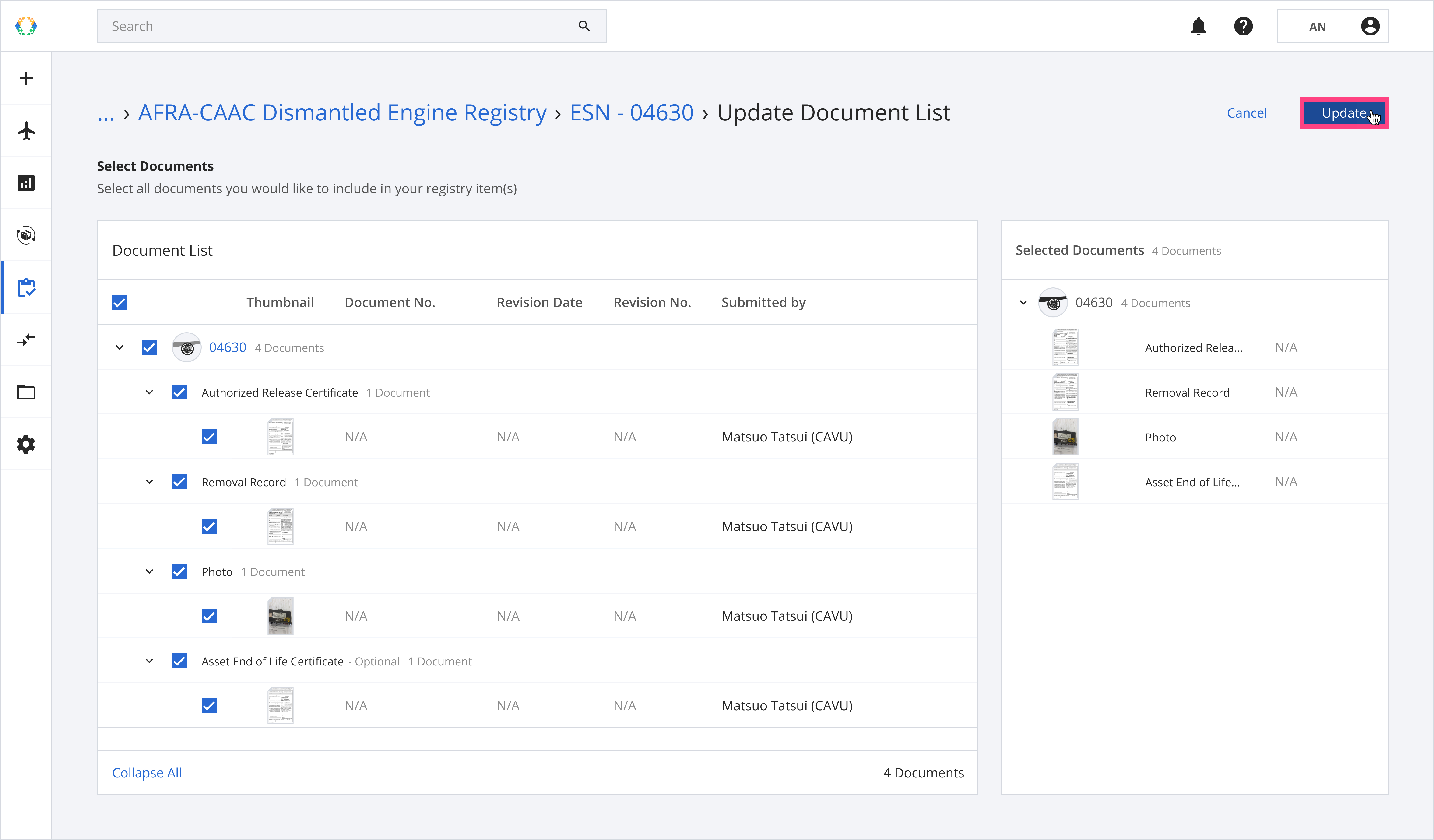Step 3: You will be directed to update document list page. Select the documents and click 'Update'.