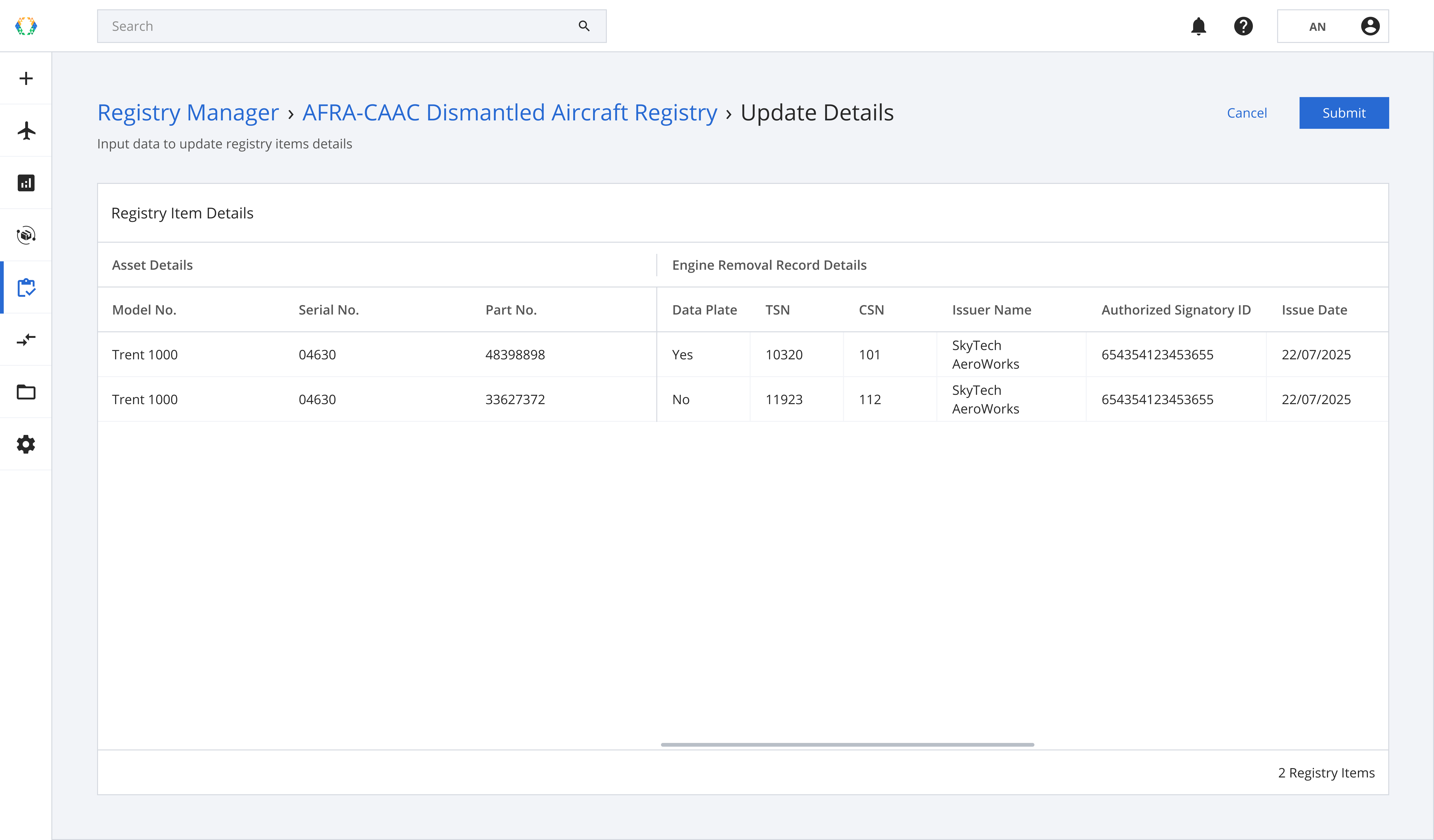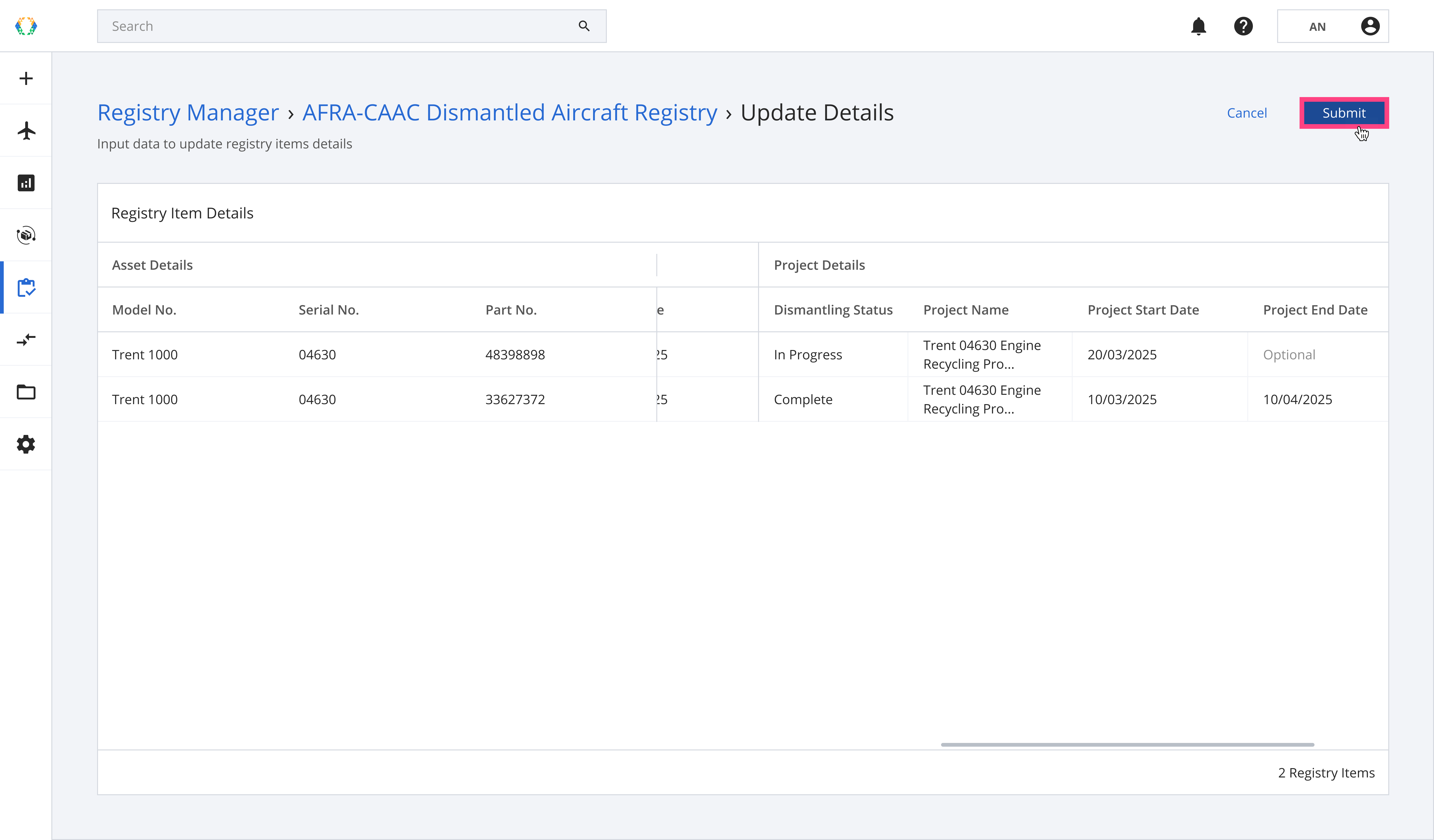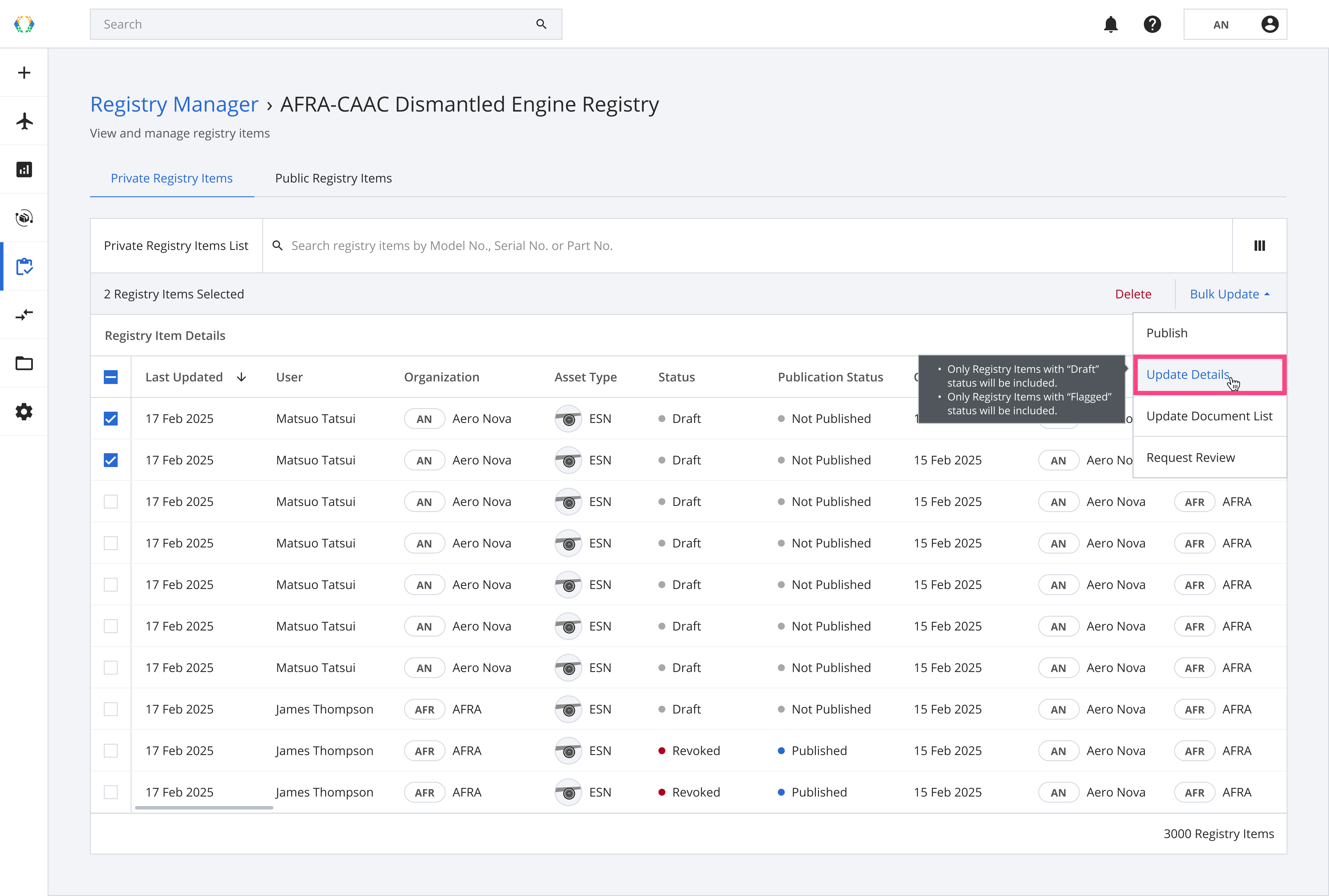 Step 1: From the engine registry items list, select registry items you want to update details.