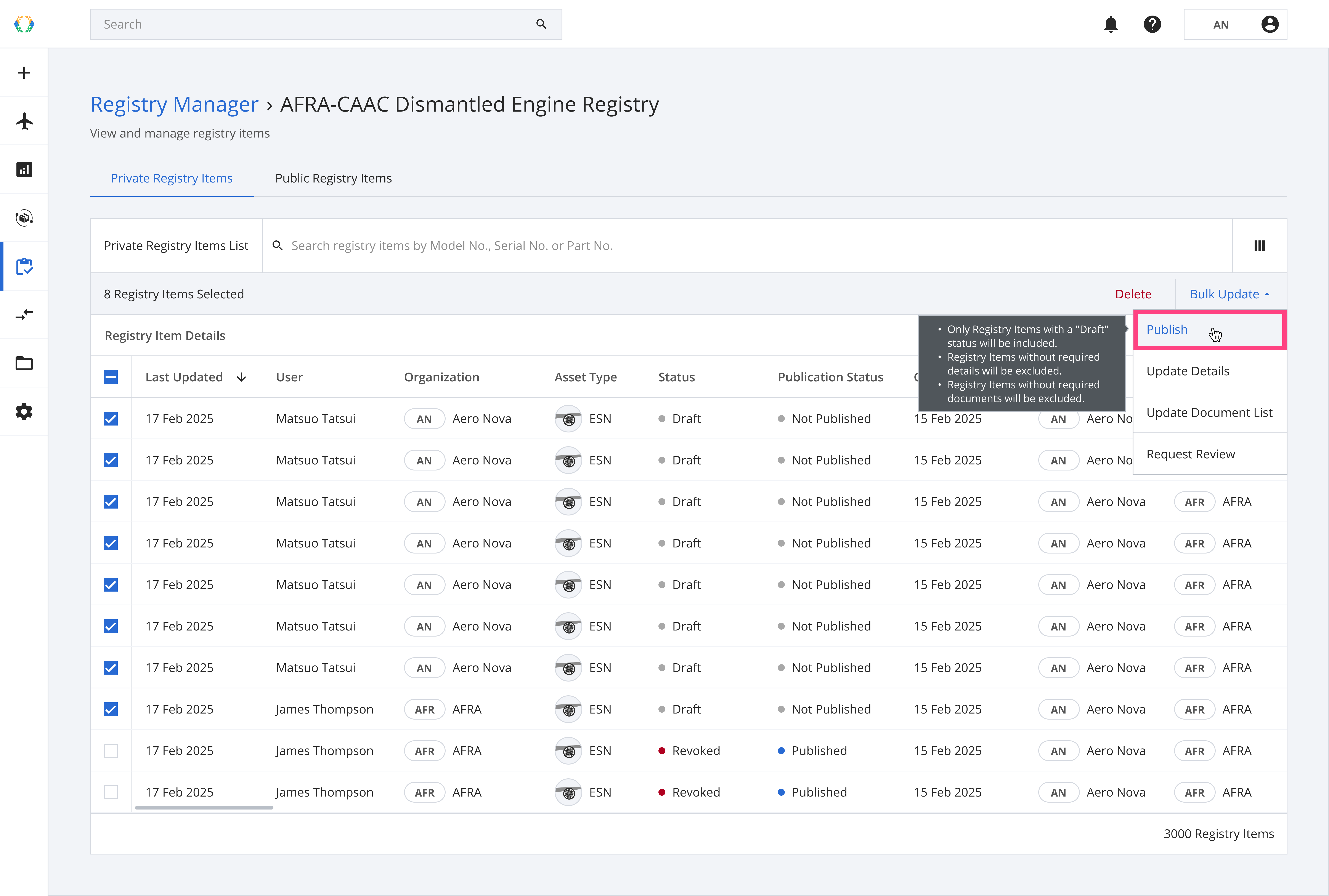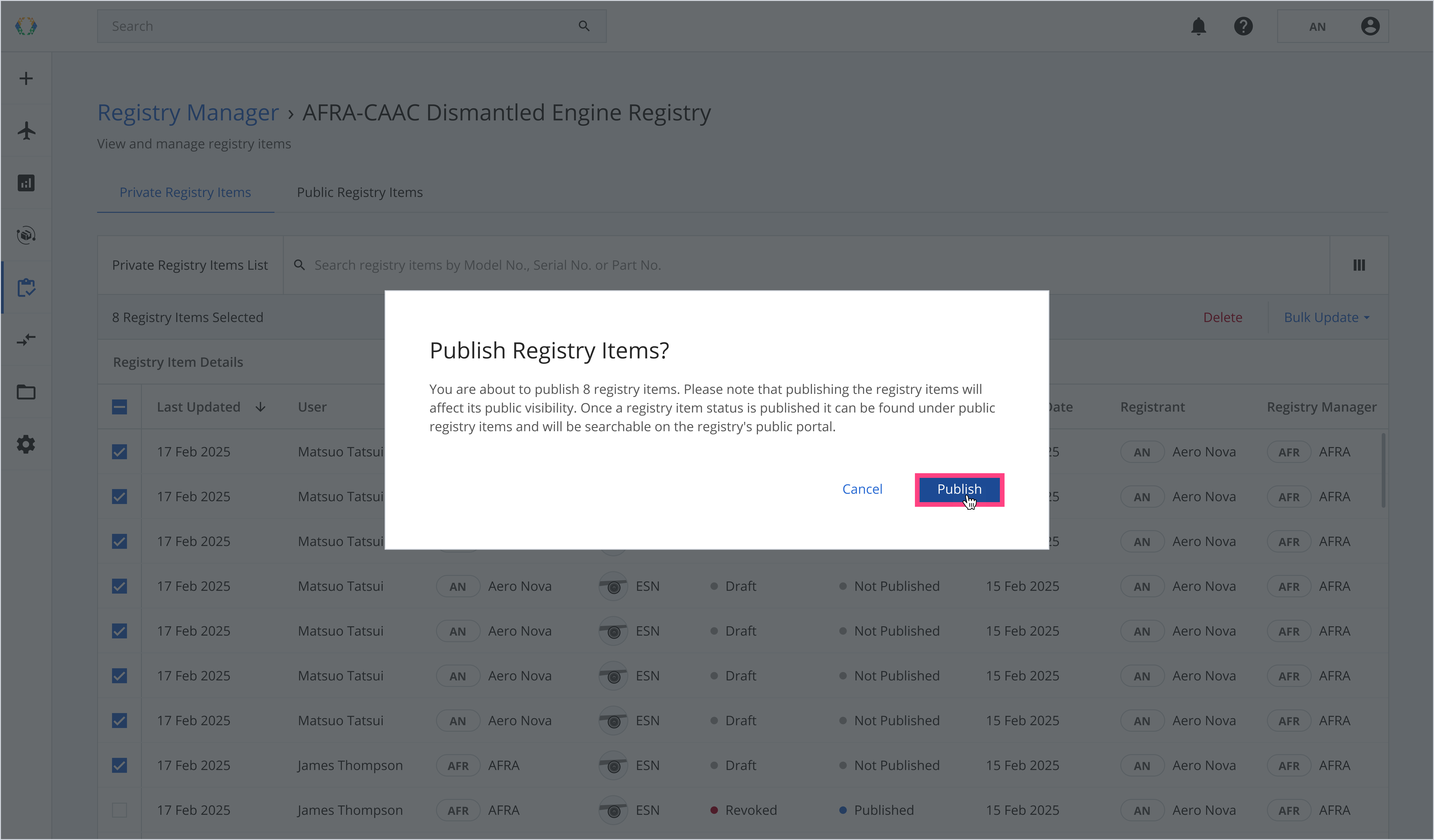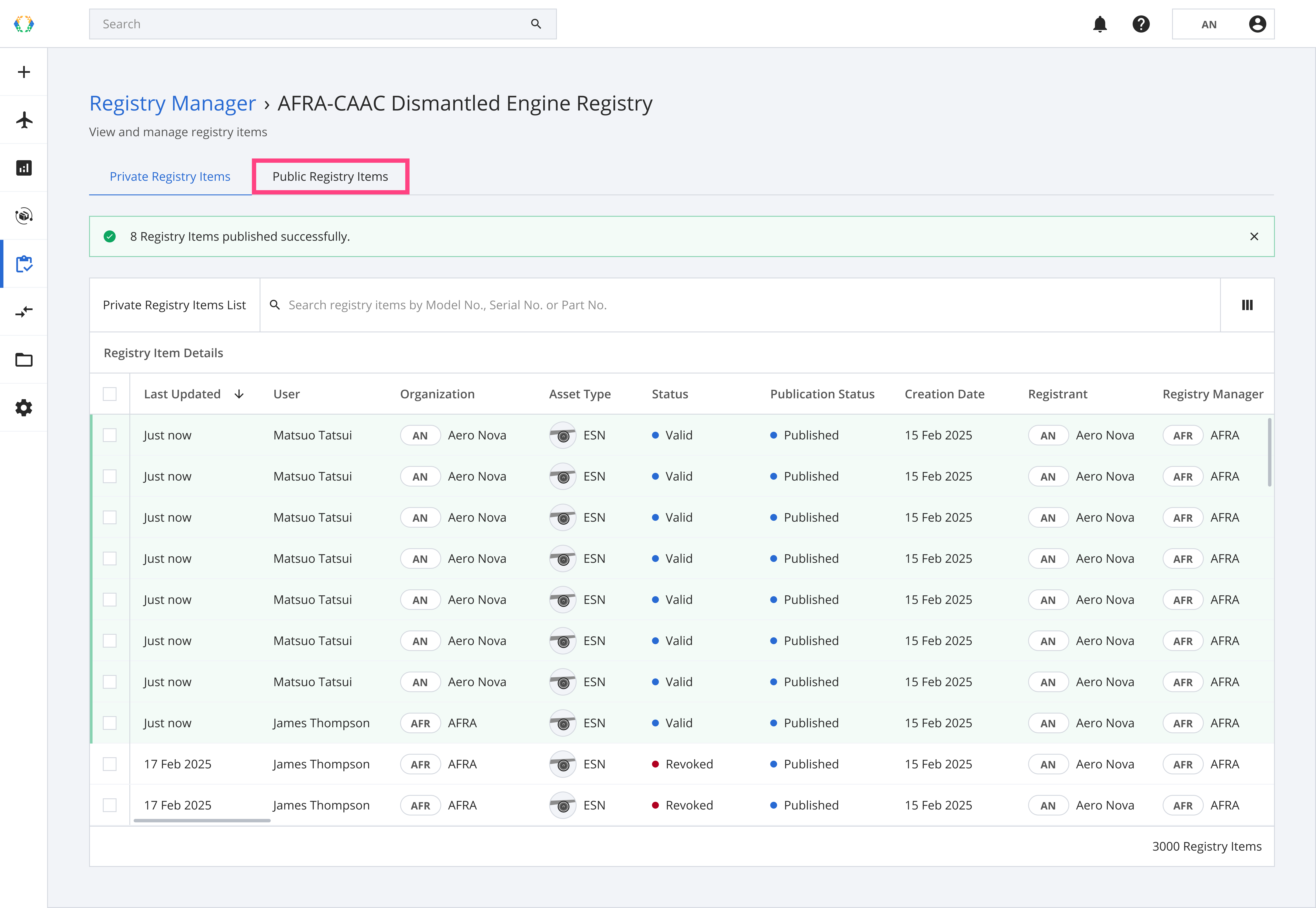 After publication, your public registry items, their documents and data will be accessible by all registry participants including Block Aero network participants and it will be searchable on the registry's public portal.