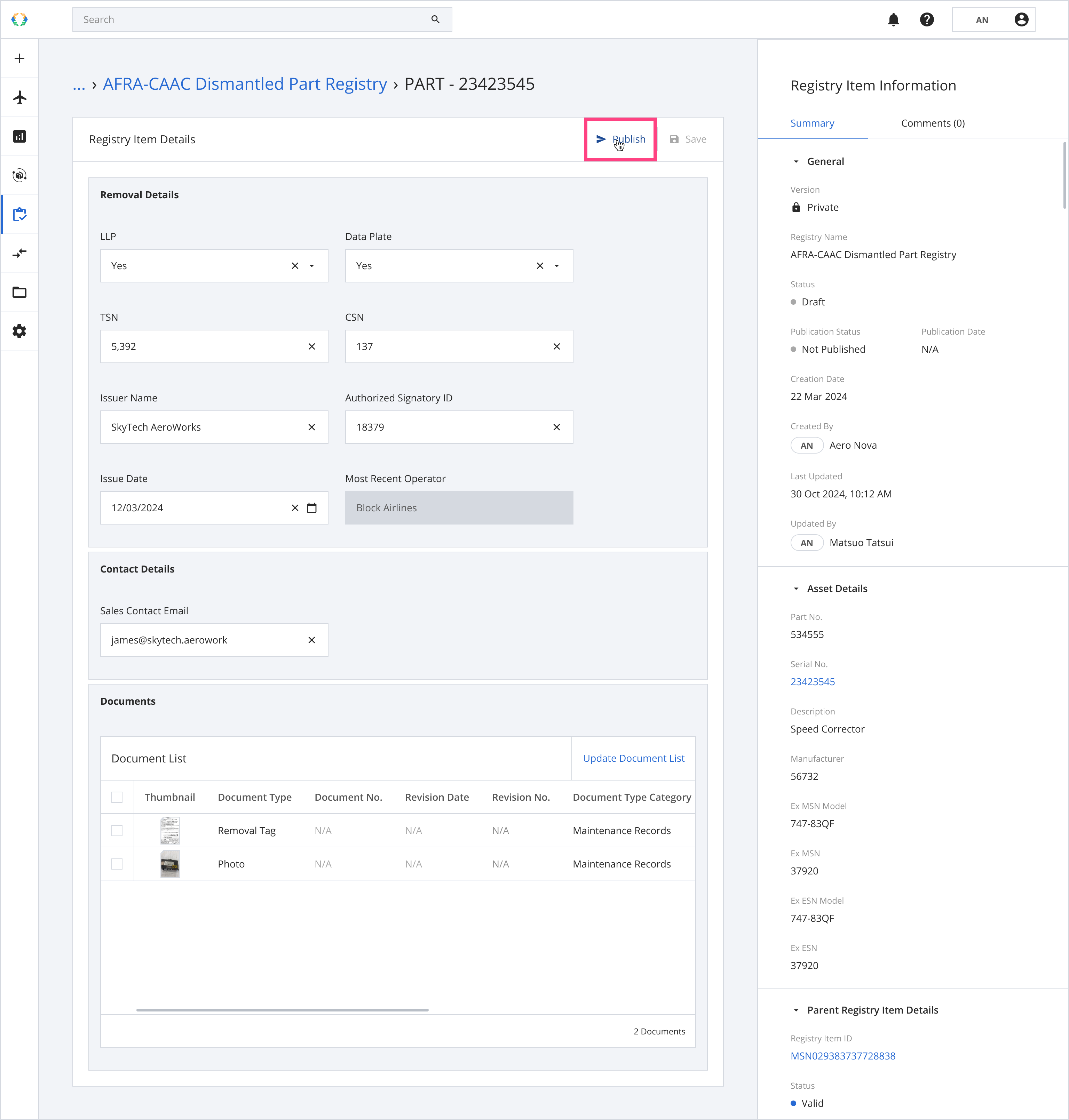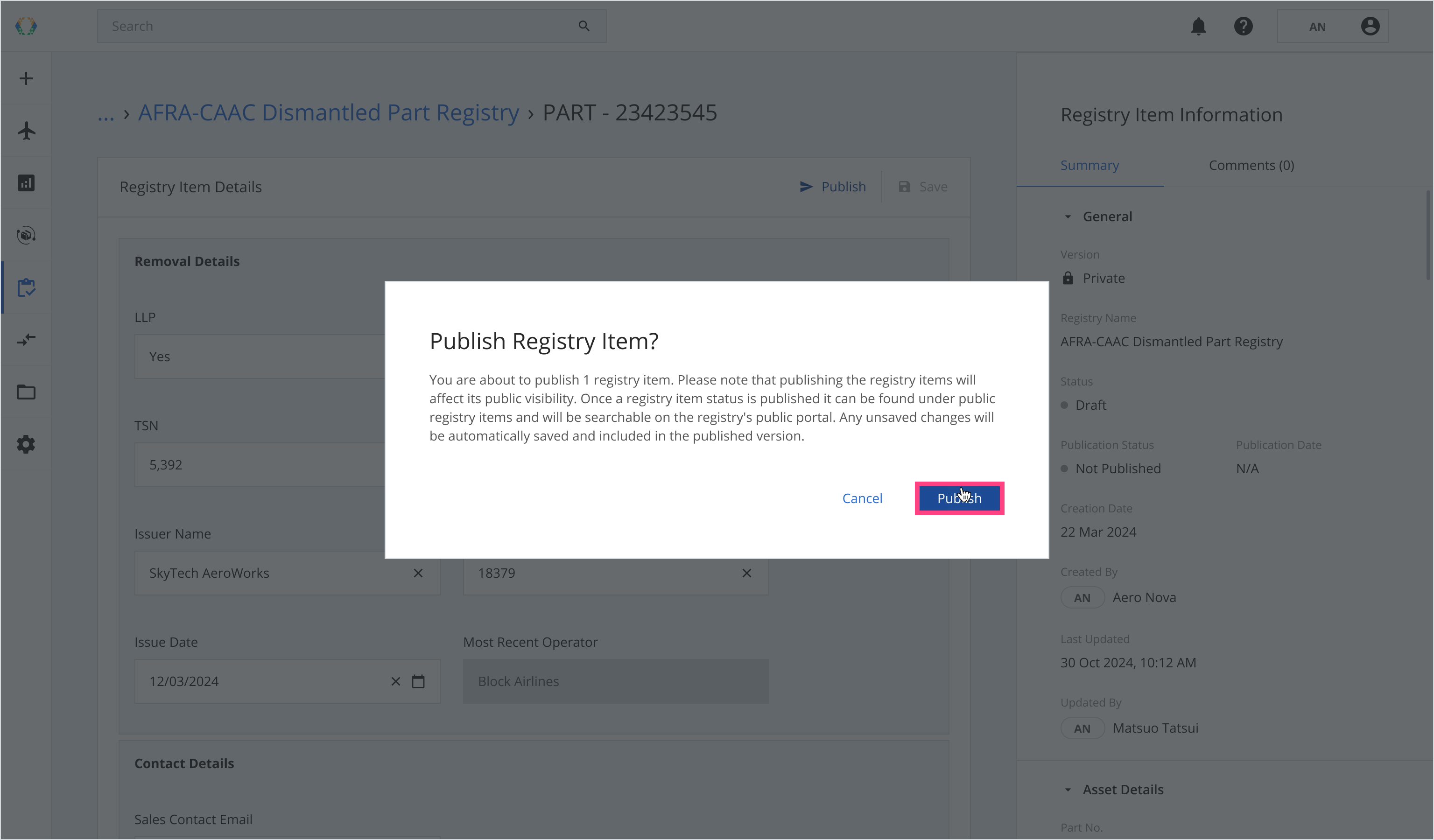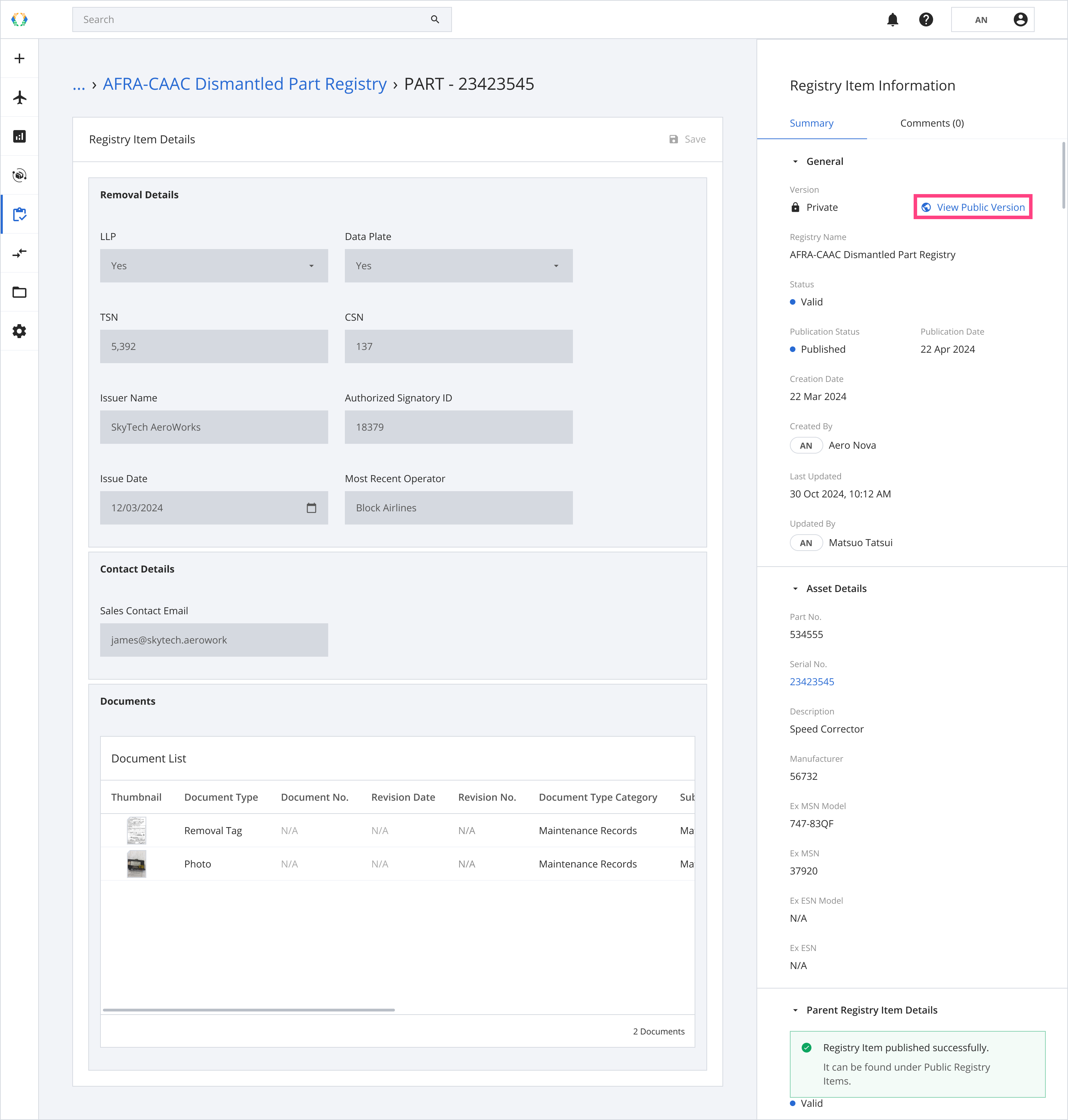After publication, your public registry item, it's documents and data will be accessible by all registry participants including Block Aero network participants and it will be searchable on the registry's public portal.