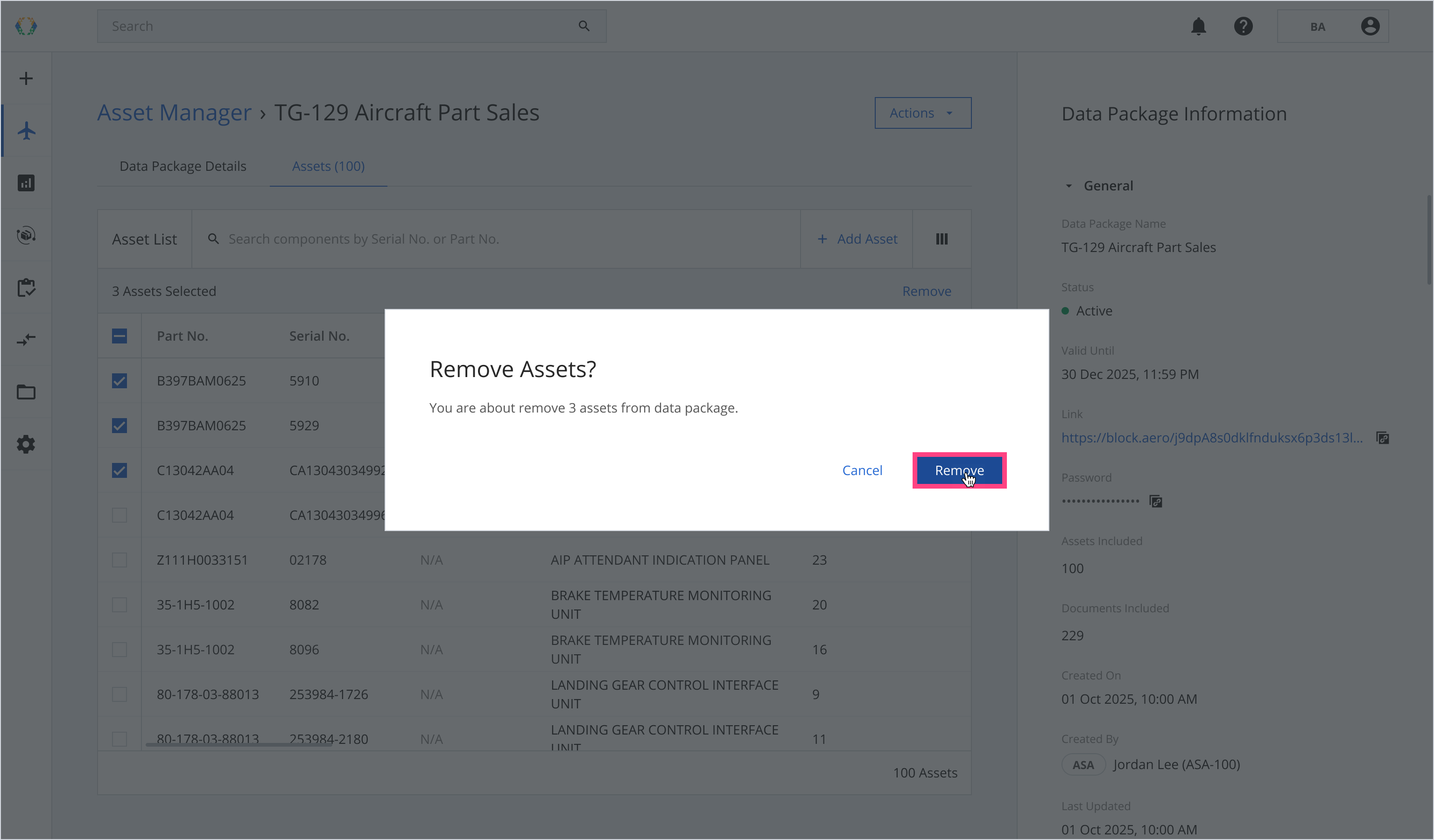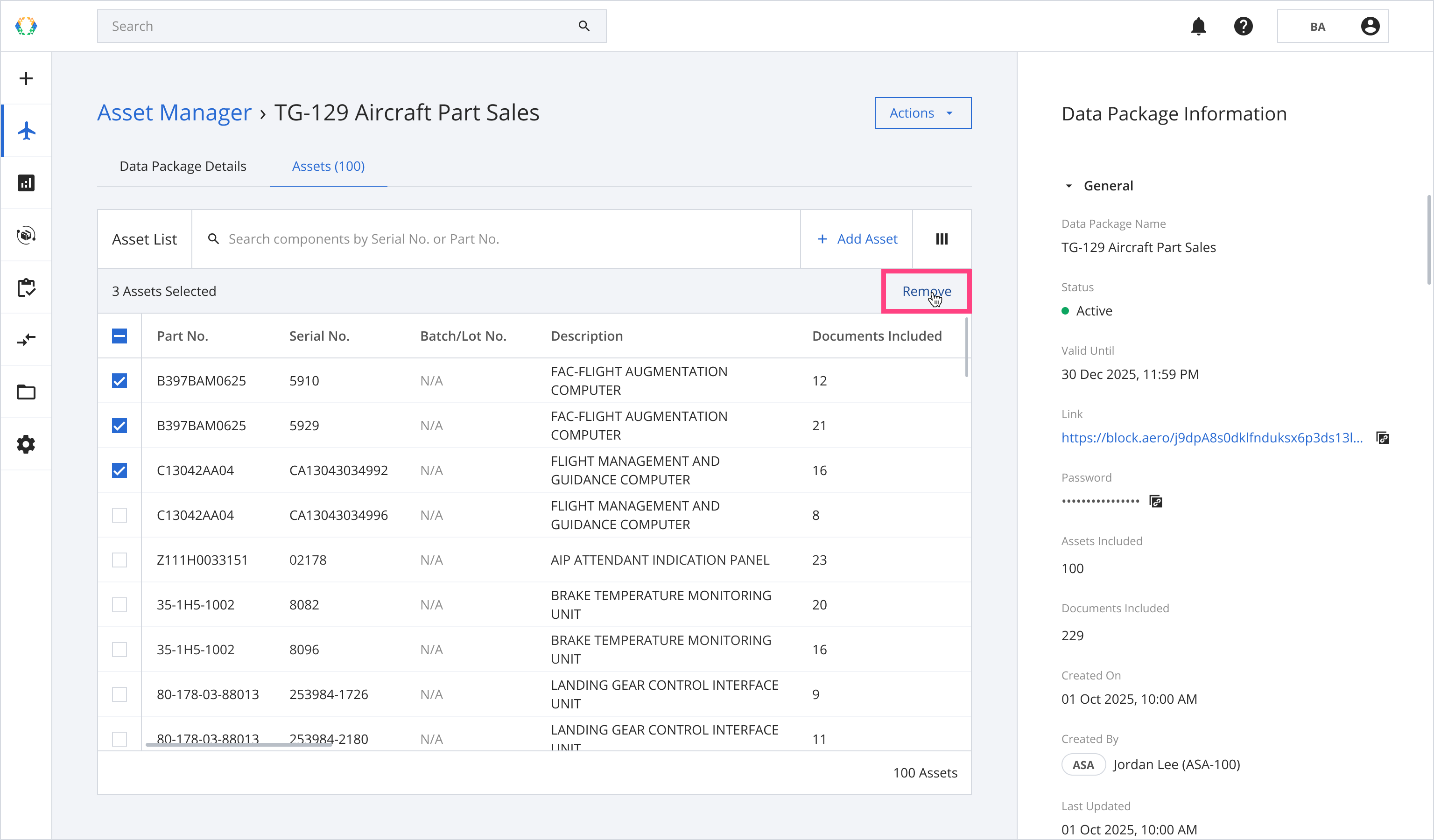 You can remove assets from active Data Packages. When an asset is removed, all associated asset data and uploaded documents within that package are permanently erased and cannot be recovered. This action does not change the package name, validity period, password, or link.