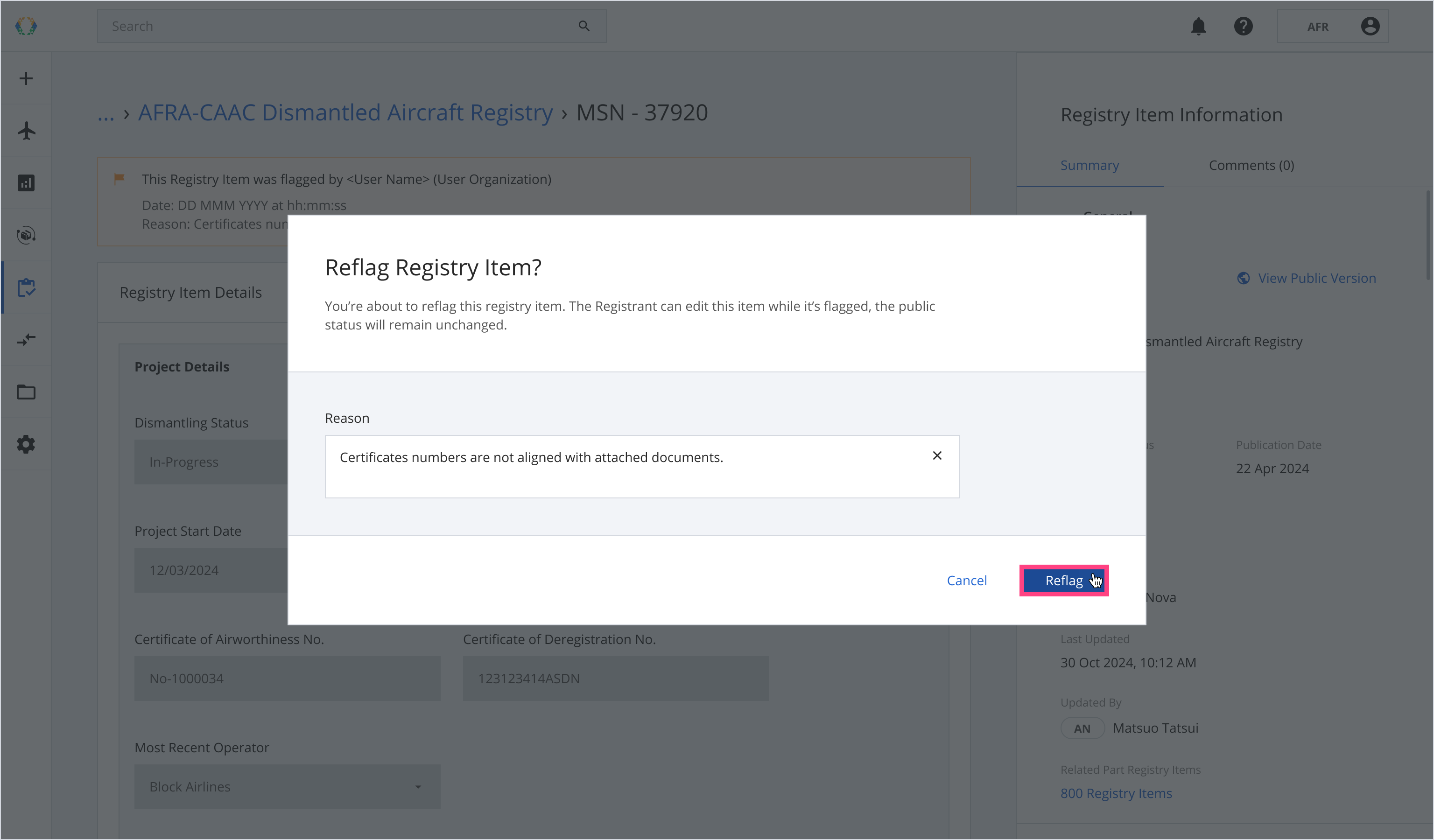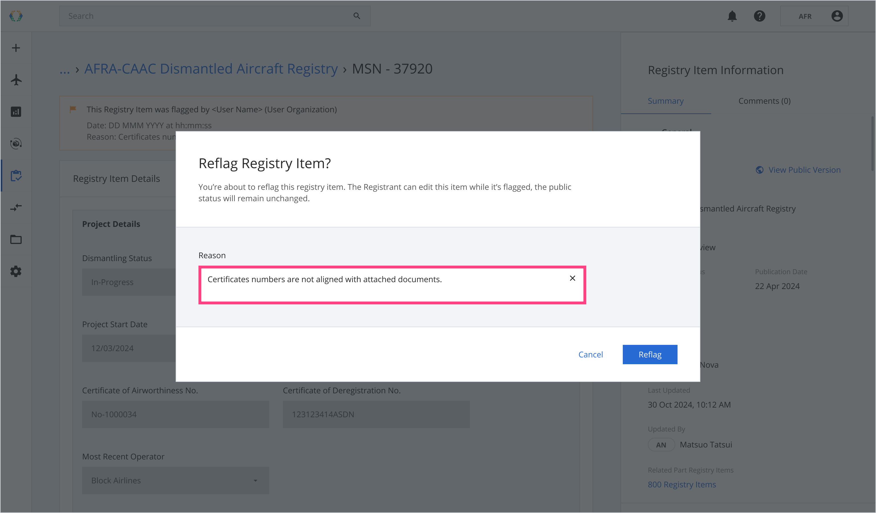 Step 3: Once the 'Reflag Registry Item?' dialog appears, the 'Reason' field will already be populated with the original reason for reflagging. You can either keep the pre-filled reason or enter a new one.