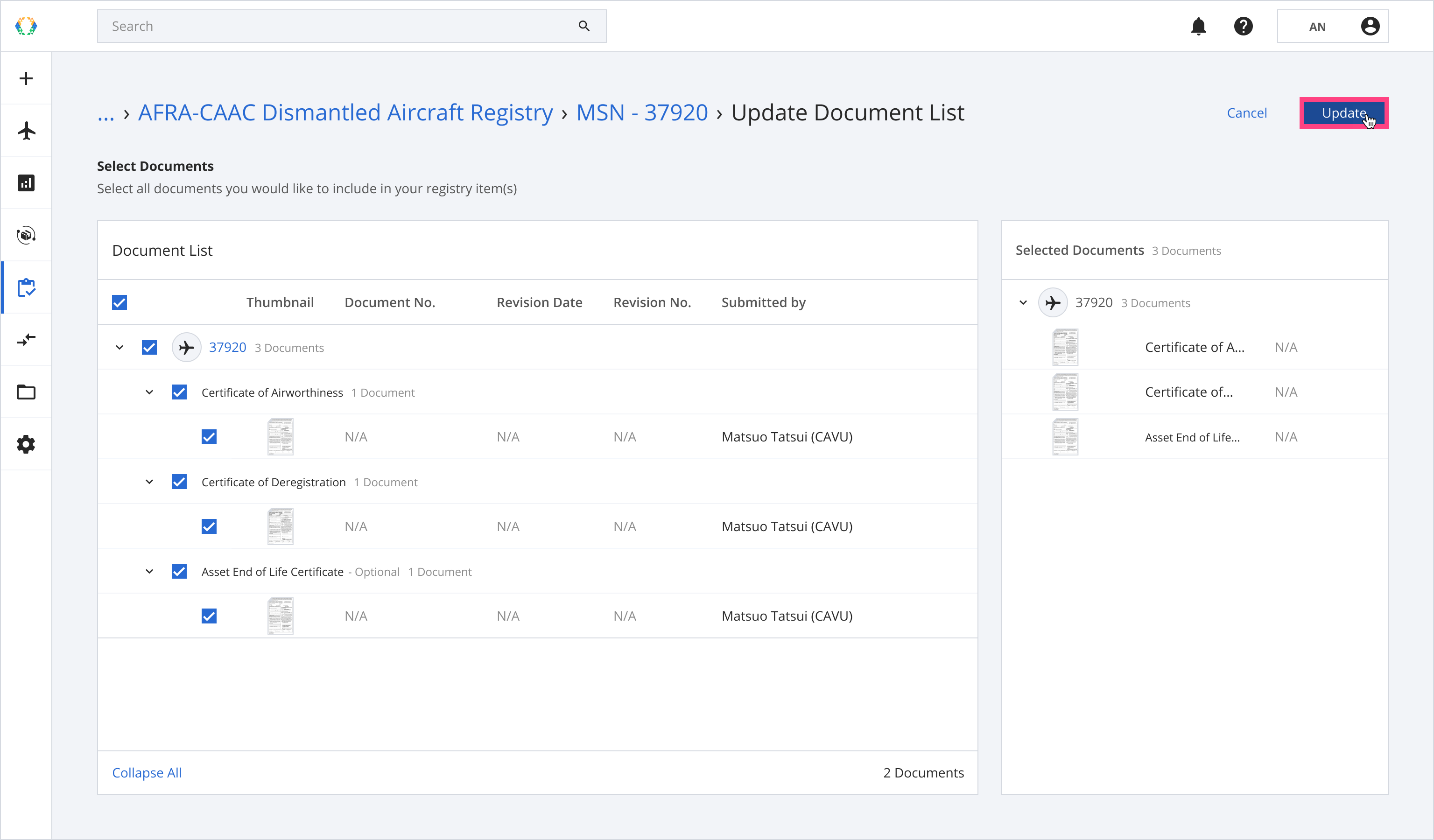 Step 3: You will be directed to update document list page. Select the documents and click 'Update'.