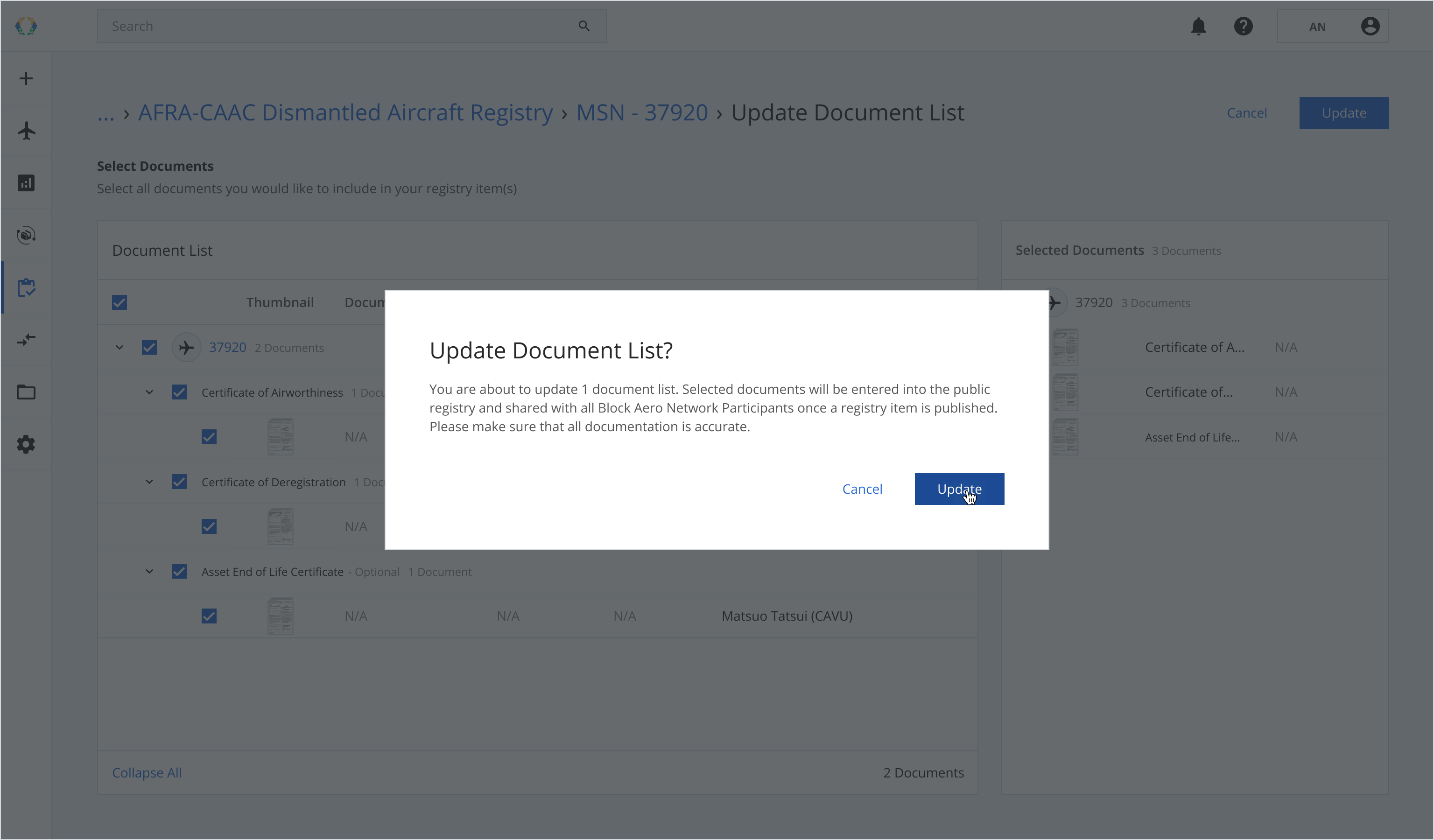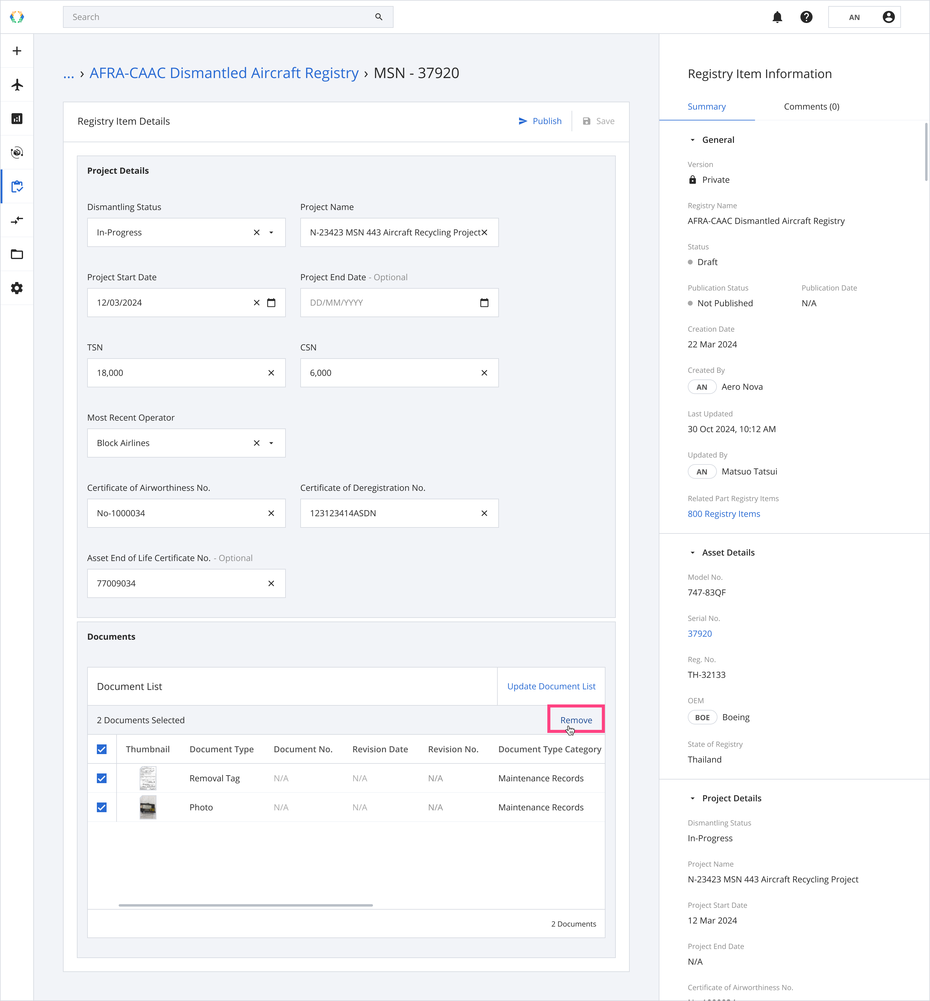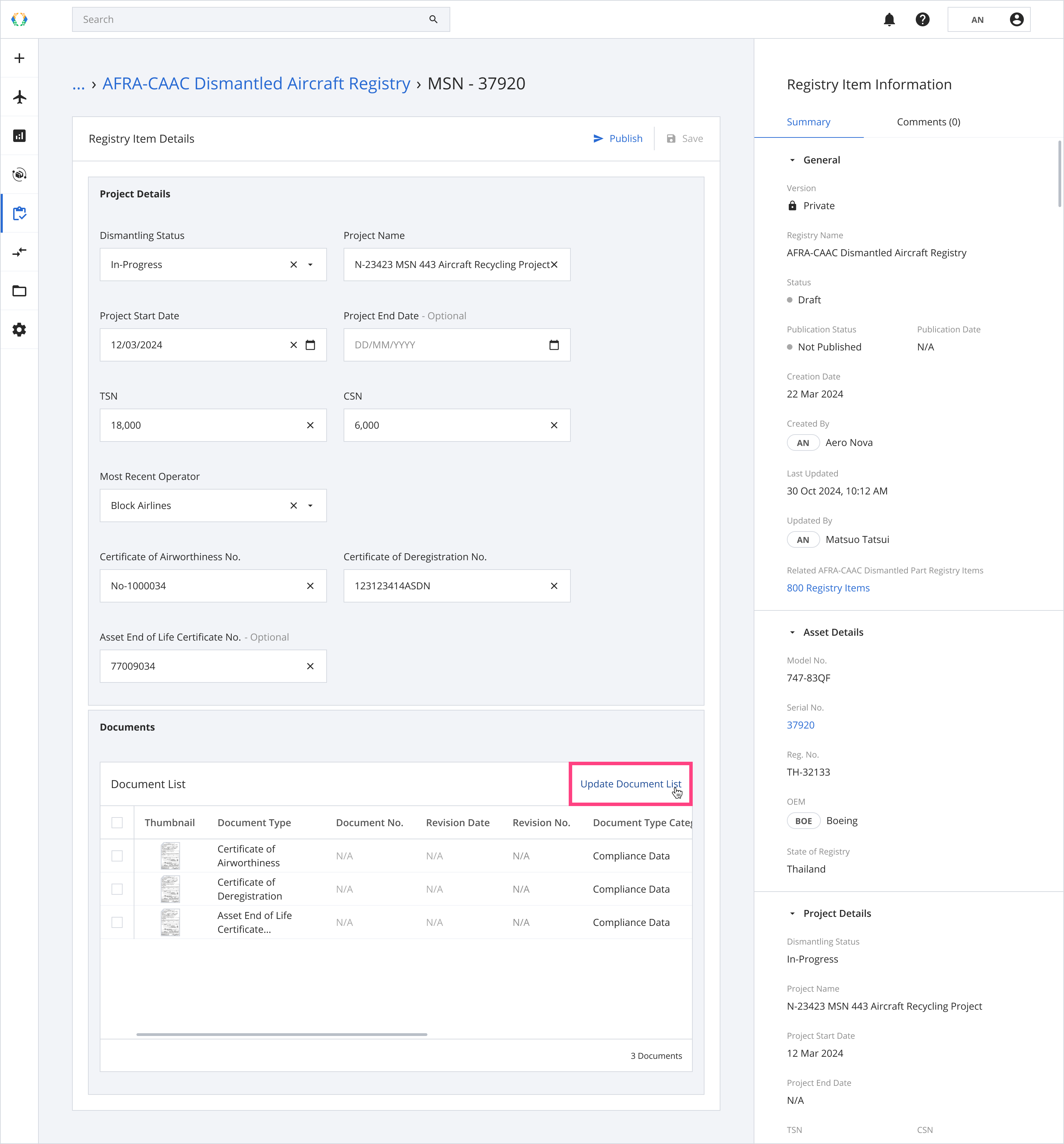 Step 1: From the aircraft registry items list, open the registry item you want to update documents for.